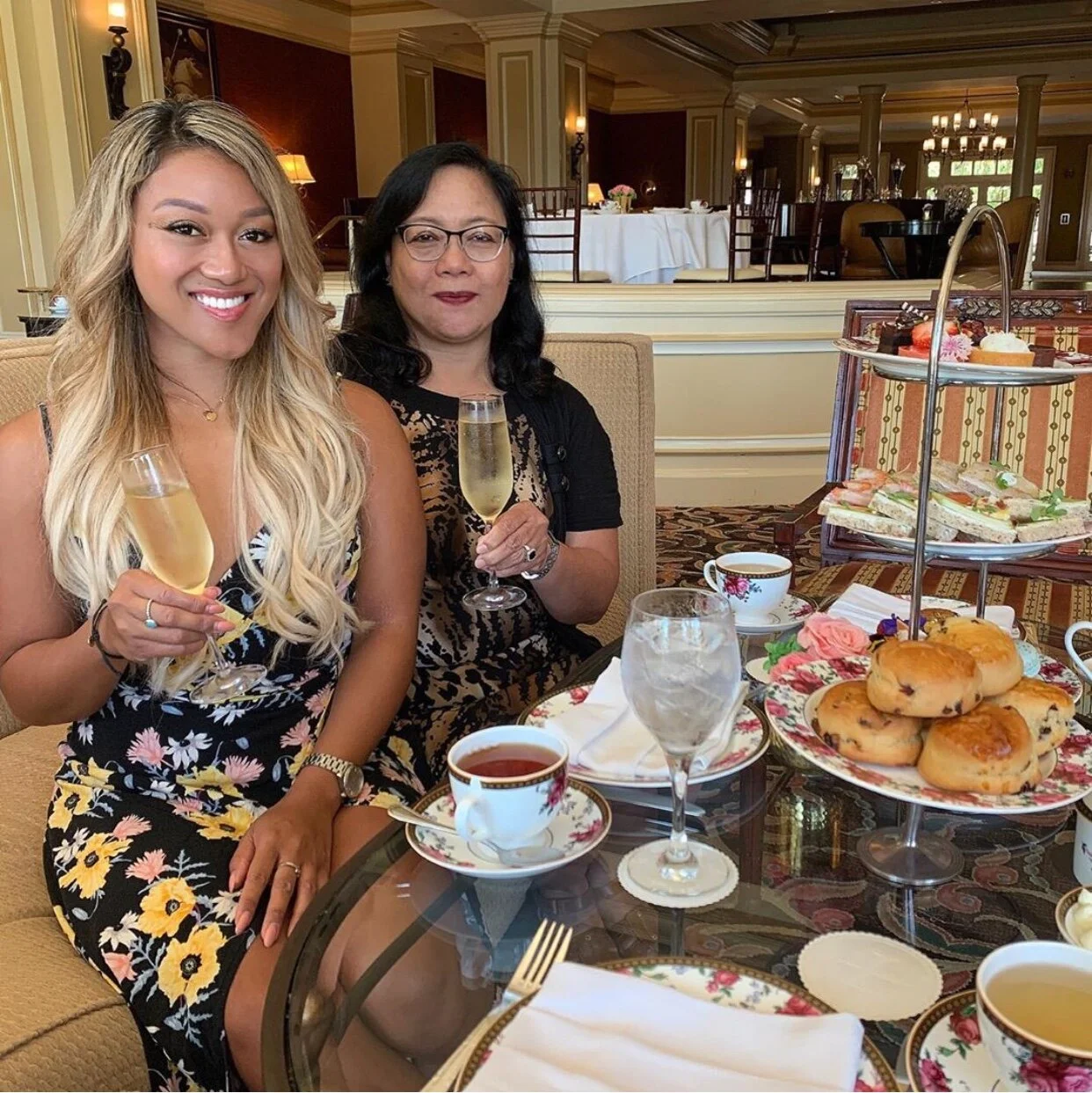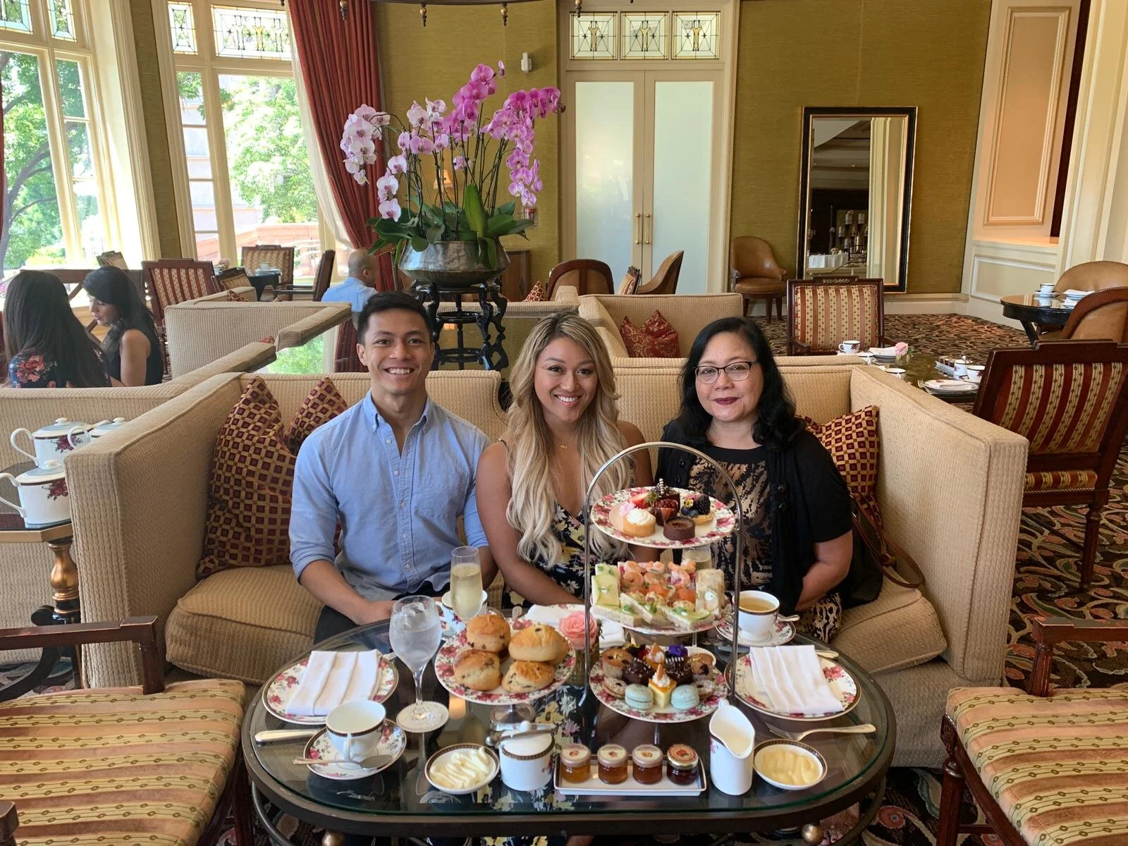 Enjoying a selection of savory tea sandwiches, scones with Devonshire cream and jam, fruit tarts, French macarons, mini-cakes, cookies and more.