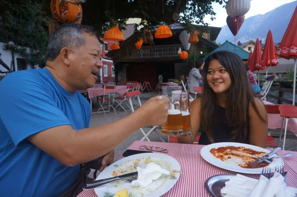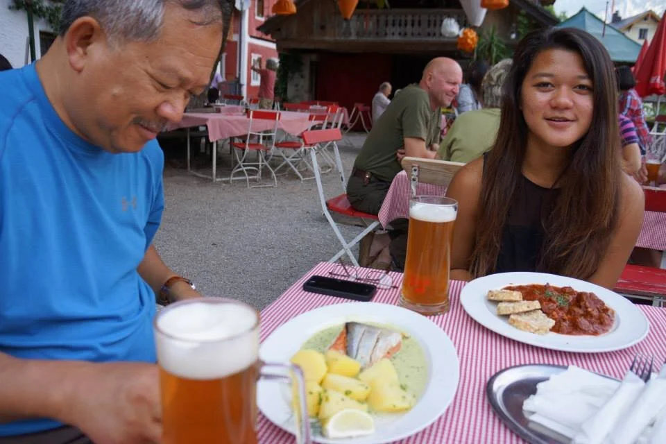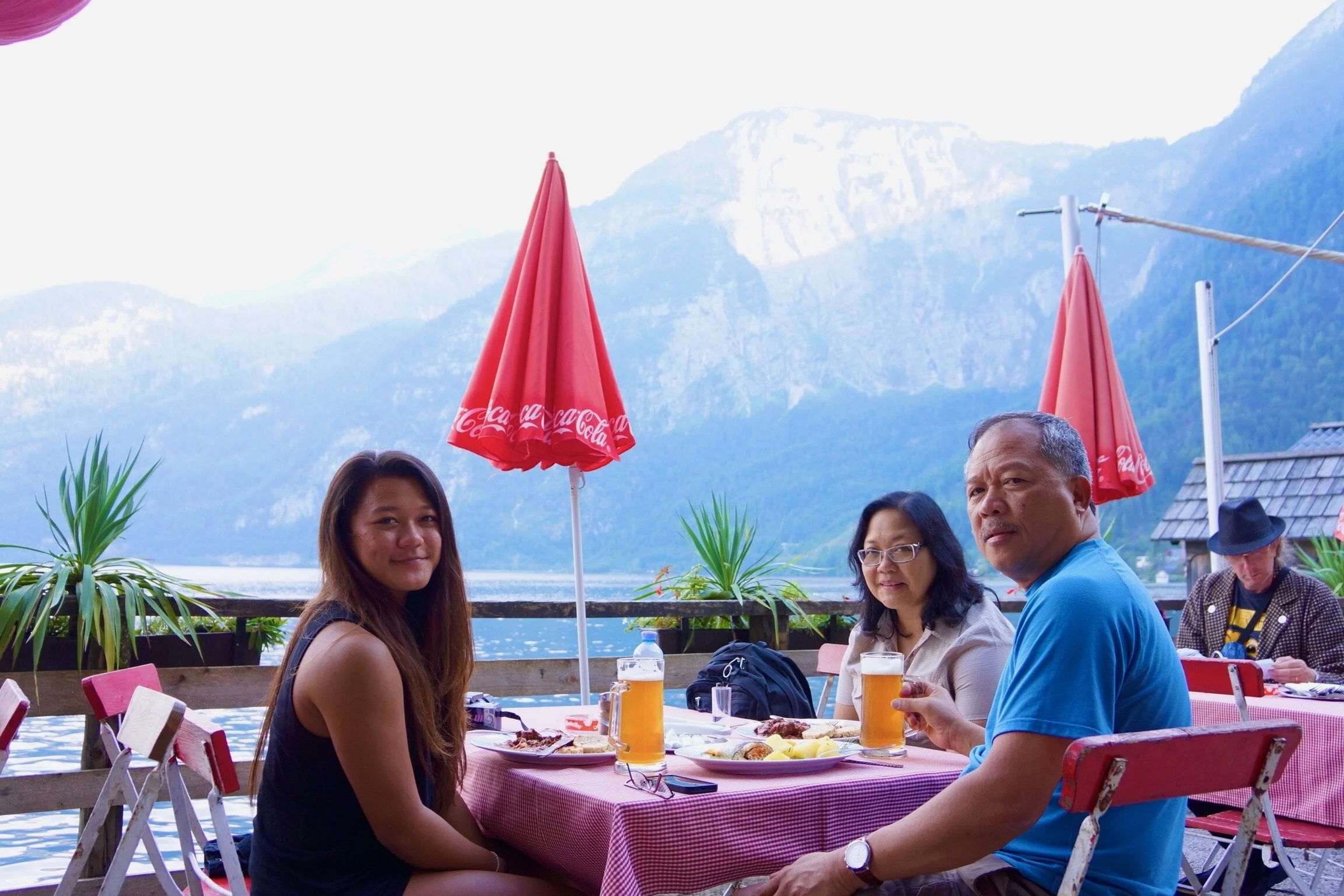 Under the 150-year-old chestnut tree directly on the shores of Lake Halstatt.